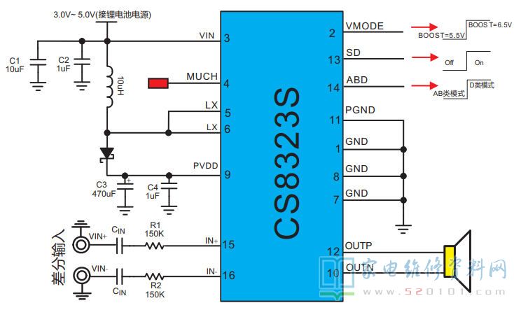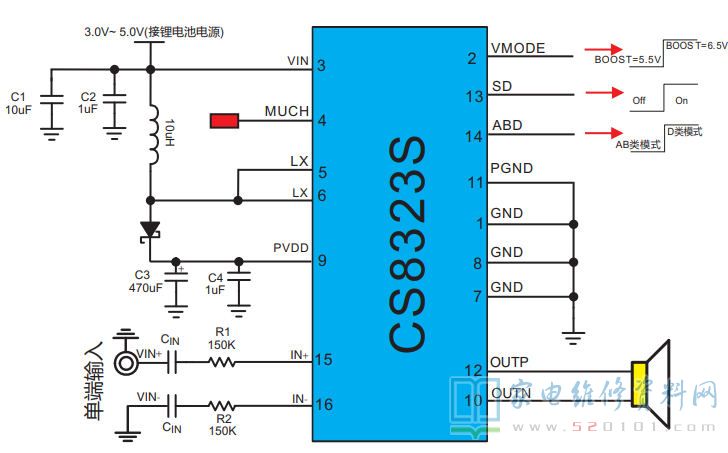 CS8323S在锂电池的供电电压范围内提供了极致的功率输出,使得CS8323S成为便携式音箱设备特别是扩音器产品的最优选择. CS8323S的全差分架构和极高的PSRR有效地提高了CS8323S对RF噪声的抑制能力。无需滤波器的PWM调制结构及内置的BOOST升压模块,尽可能的减少了外围器件,另外CS8323S内置了过流保护,短路保护和过热保护,有效的保护芯片在异常的工作条件下不被损坏。