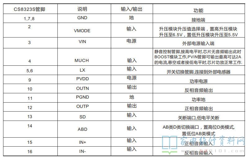 概述:CS8323S是一款内置BOOST升压模块的R类音频功率放大器,其内置的BOOST升压模块在5.5V和6.5V两个电压点之间可选。当BOOST升压模块在5.5V的情况下,可以为4Ω的负载提供3.7W的恒定功率,并通过MUCH使能端的控制,BOOST模块可以单独提供最高可达2A的电流输出;当BOOST升压模块在6.5V的情况下,可以为4Ω的负载提供5.0W的恒定功率.AB类D类可切换模式的设计,最大限度的减少音频子系统中功放对FM的干扰。