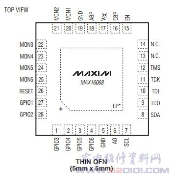 概述:MAX16068提供5×5mm、28引脚TQFN封装,具有2.8V至14V较宽的工作电压范围,允许直接采用中等电压的总线供电.