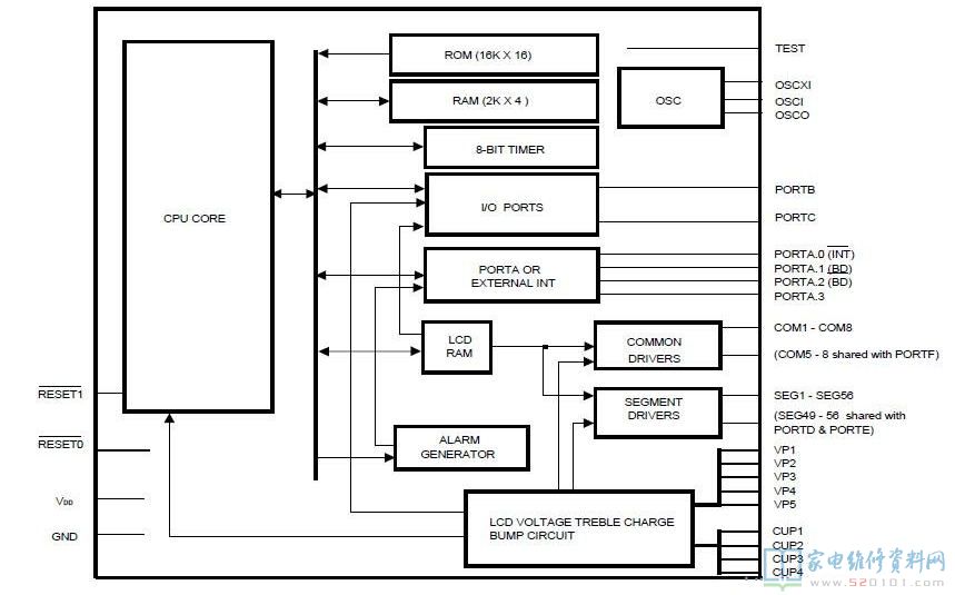 内建闹铃信号发生器(载波频率:2KHzor4KHz.通过系统寄存器选择)