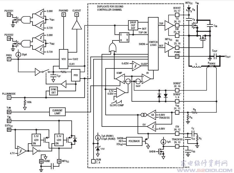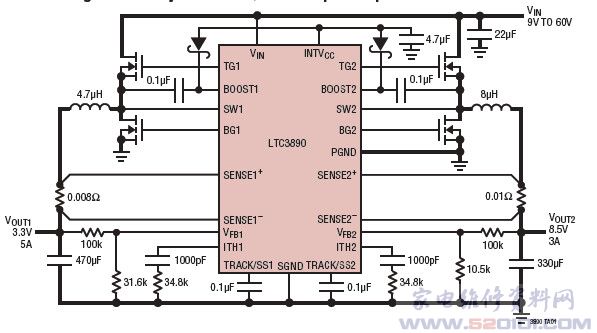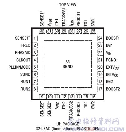 概述:LTC3890采用32引线5×5mmQFN封装。为高压双输出同步降压型DC/DC控制器。当一路输出工作时,该器件仅吸取50uA电流,而两路输出都启动时则吸取60uA。输入电源电压范围4V 至 60V 。在输出电流高达 20A 和效率高达 95% 时,每路输出都可以设定在 0.8V 至 24V。具有强大的 1.1Ω 片上 MOSFET 栅极驱动器。该器件以 50kHz 至 900kHz 的可选固定频率运行,而且可以用其锁相环 (PLL) 同步至 75kHz 至 850kHz 的外部时钟。在轻负载时,用户可以选择连续运行、脉冲跳跃和低纹波突发模式 (Burst Mode®) 运行。其电流模式架构允许非常容易地实现环路补偿、快速瞬态响应和卓越的电压调节。输出电流检测通过测量输出电感器 (DCR) 两端的电压降完成,以实现最高的效率;或通过使用一个可选的检测电阻器完成。电流折返在过载情况下限制了 MOSFET 的热量。功能包括时钟输出、时钟相位调制、两个独立的电源良好输出和可调电流限制。