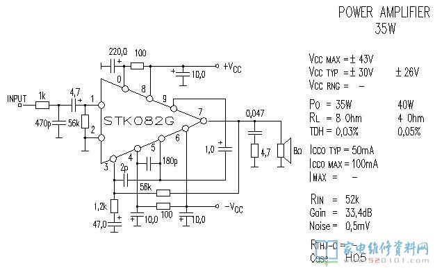 概述:STK082G是三洋半导体公司早期出品的一款音频功率放大器厚膜IC芯片,其最大工作电压43V,在典型工作电压30V时,其通道输出功率为35W(TDH=0.03%)。