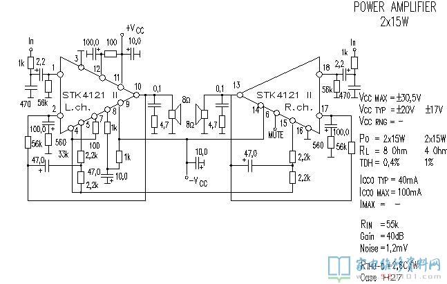 概述:STK4121II是三洋半导体公司出品的一款双通道音频功率放大器IC芯片,其最大工作电压30.5V,在典型工作电压20V时,其每通道输出功率为15W。