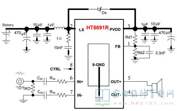 概述:HT8691R是一款内置BOOST升压模块的D类音频功率放大器。其内置的BOOST升压模块可通过外置电阻调节升压值,即使是锂电池供电,在升压至7.5V,2Ω负载条件下则能连续输出11W功率。其支持外部设置调节BOOST输出电压。 HT8691R的最大特点是防削顶失真(ACF)输出控制功能,可检测并抑制由于输入音乐、语音信号幅度过大所引起的输出信号削顶失真(破音),也能自适应地防止在BOOST升压电压下降所造成的输出削顶,显著提高音质,创造非常舒适的听音享受,并保护扬声器免受过载损坏。同时芯片具有ACF-Off 模式。 HT8691R具有AB类和D类的自由切换功能,在受到D类功放EMI干扰困扰时,可随时切换至AB类音频功放模式。 HT8691R内部集成免滤波器数字调制技术,能够直接驱动扬声器,并最大程度减小脉冲输出信号的失真和噪音。输出无需滤波网络,极少的外部元器件节省了系统空间和成本,是便携式应用的理想选择。 此外,HT8691R内置的关断功能使待机电流最小化,还集成了输出端过流保护、片内过温保护和电源欠压异常保护等功能。