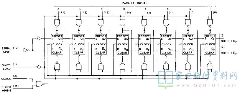概述:74LS165是一款8位并行输入、串行输出移位寄存器,其典型应用电路如图1所示。A~H:并行数据输入端;QH、QL:串行数据输出端;CP:时钟输入端。CLKINH:时钟禁止端,当该端为低电平时,允许时钟输入;S/L:移位与置位控制端;SER. IN:扩展多个74LS165的首尾连接端。当①脚为低电平时,芯片将输入数据A~H分别存入内部对应的寄存器中,随即①脚变为高电平。当②脚接收到8个时钟脉冲后,并行数据从⑨脚( QH )和⑦脚( QL)串行移出(⑦脚移出的数据是反相的)。