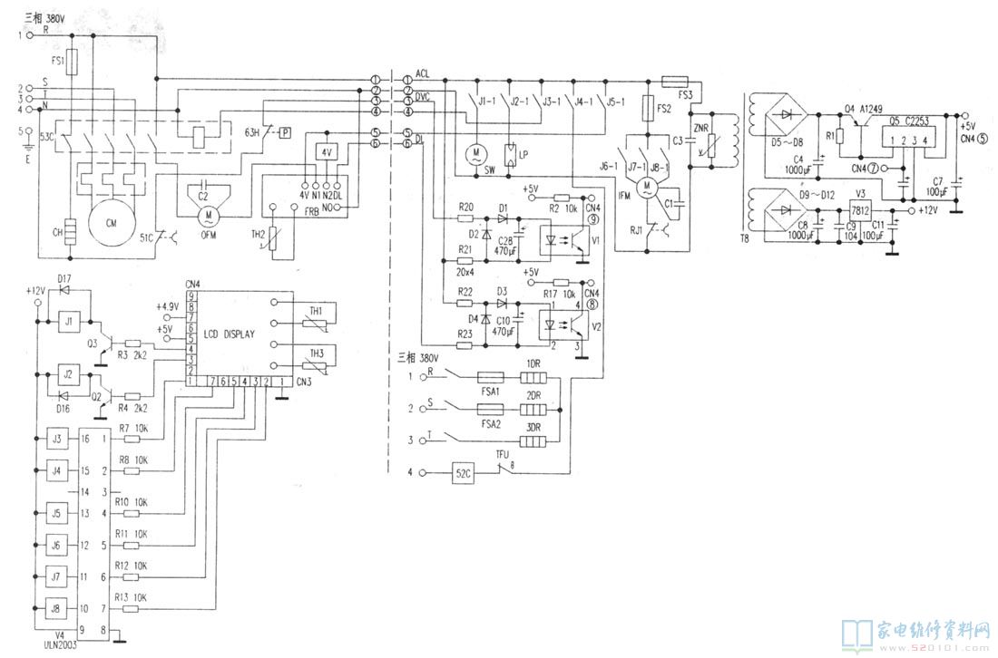 (1)制冷:接通电源,延时几分钟后,从液晶显示器LCE的CN4①脚和CN3③脚输出4.9V电压.经过R7、R12降压为2v到ULN2003的⑥脚、①脚输入端,使11、16脚输出低电平,J3、J7继电器动作,交流接触器53C得电工作,室内室外风机、压缩机开始工作处于制冷状态。(2)制热:来自LCD的4.9V控制电压通过CN4①脚、CN3③、⑤、⑦脚输入,使ULN2003的11、13、15、16脚输出低电平,使J4继电器动作,52C交流接触器接通,使三只辅助电加热1DR-3DR工作,J5动作使电磁换向阀4V得电工作,J3、J7动作使室内室外风机、压缩机工作使系统处于制热状态。