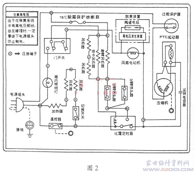 电路如图2,图示状态为箱门关闭,压缩机运行,除霜系统不工作。图3是电气接线图。