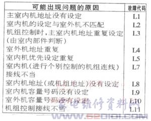 一台新装SPW-C253DHL8型空调器显示E4告警。 E4表示室内机正在检测室外机异常信号,故障应在内外机串行信号收发电路,但检查相关线路无异常。可能真正故障正在检索中,二次开机出现E15告警,说明自动地址设置异常,室内机的数量或容量被判断为很小,可能室内机存在故障。果然空调器最后检索出F10告警。但故障表中没有F10列出,但该系列机F类告警均为温度传感热敏电阻不良。逐一检查温度传感器,结果发现室温传感器松脱。附表为三洋牌SPW—C253DH系列空调器的故障代码表,供参考。