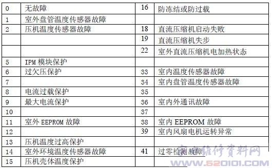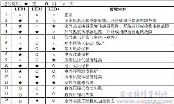在压缩机停止运转时,室外的LED用于显示故障的内容,如下表所示: